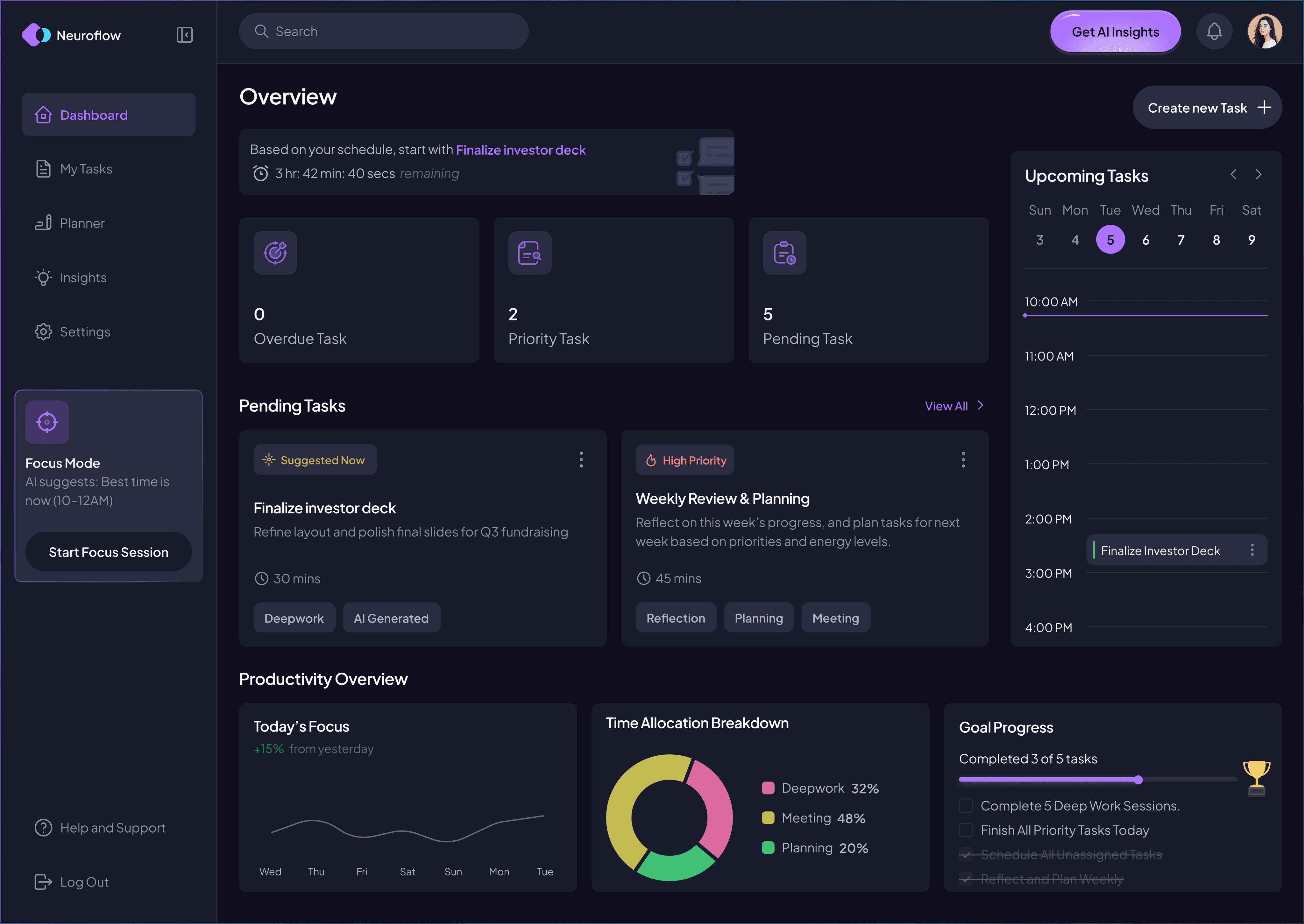 NeuroFlow constantly analyzes your behavior, time blocks, and focus patterns to deliver real-time, actionable insights — helping you prioritize smarter and work more efficiently.